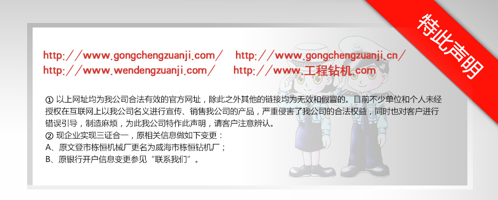 威海市棟恒鉆機(jī)廠隸屬于文登市工程鉆機(jī)廠,主要生產(chǎn)、銷售工程鉆機(jī)。它坐落于文登市西鋪頭工業(yè)園,這里科技發(fā)達(dá),交通便利,制造業(yè)集中。 自1982年建廠以來(lái),經(jīng)過多年的優(yōu)化改革和沉淀積累,擁有精密、大型加工設(shè)備近百臺(tái)的生產(chǎn)企業(yè)之一。現(xiàn)在研制成功的GJ-400、GJ-250S、GJ-250A、GJ-240S、GJ-240A、GJ-180S、GJ-180A型等鉆機(jī)。在其它產(chǎn)品上,企業(yè)建立了長(zhǎng)期、中期、短期的發(fā)展規(guī)劃,一系列的高性能產(chǎn)品正在不斷推出中,企業(yè)應(yīng)市場(chǎng)需求對(duì)系列產(chǎn)品進(jìn)行了優(yōu)化組合,開發(fā)了與之對(duì)應(yīng)配套的三腿、四腿單天車輪、雙天車輪鉆塔;泥漿泵—BW-160Q、BW- 200Q型球形閥泥漿泵大大提高了泵的使用性能和機(jī)械效率